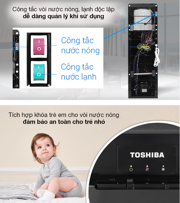 Không chỉ sở hữu thiết kế nguyên khối sang trọng với tông màu đen chủ đạo, Cây nước nóng lạnh Toshiba RWF-W1917TV(K) còn được tích hợp nhiều công nghệ tiên tiến. Máy nén hiệu suất cao giúp làm lạnh nhanh chóng, đáp ứng nhu cầu giải khát tức thì trong những ngày hè nóng bức. Ba chế độ nước nóng, lạnh và thường cùng khóa an toàn cho trẻ em mang đến sự tiện lợi và an tâm tuyệt đối khi sử dụng.