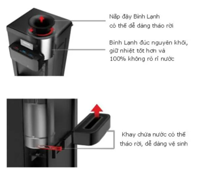 Nắp bình lạnh và khay hứng nước thừa của Cây nước nóng lạnh Toshiba RWF-W1917TV(K) được thiết kế có thể tháo rời, giúp bạn dễ dàng vệ sinh và lau chùi sản phẩm. Điều này không chỉ đảm bảo vệ sinh an toàn thực phẩm mà còn giúp máy luôn sạch sẽ và bền bỉ.