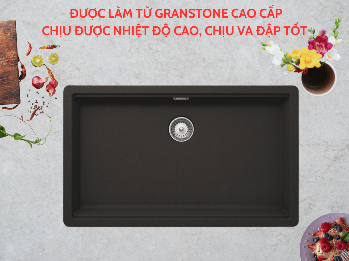 Thiết kế hố chậu hình chữ nhật vuông vức, các góc cạnh khoẻ khoắn, hiện đại, cùng với màu đen sang trọng, dễ dàng kết hợp với mọi kiểu thiết kế nội thất và tạo điểm nhấn tinh tế cho không gian nấu nướng của bạn. Đặc biệt, chậu được làm từ chất liệu đá Granstone cao cấp, thành phần cấu tạo với hơn 75% là đá thạch anh, sở hữu nhiều đặc tính ưu việt về tính thẩm mỹ cũng như độ bền sử dụng, tăng thêm đẳng cấp cho gian bếp và thể hiện gu thẩm mỹ tinh tế của gia chủ.