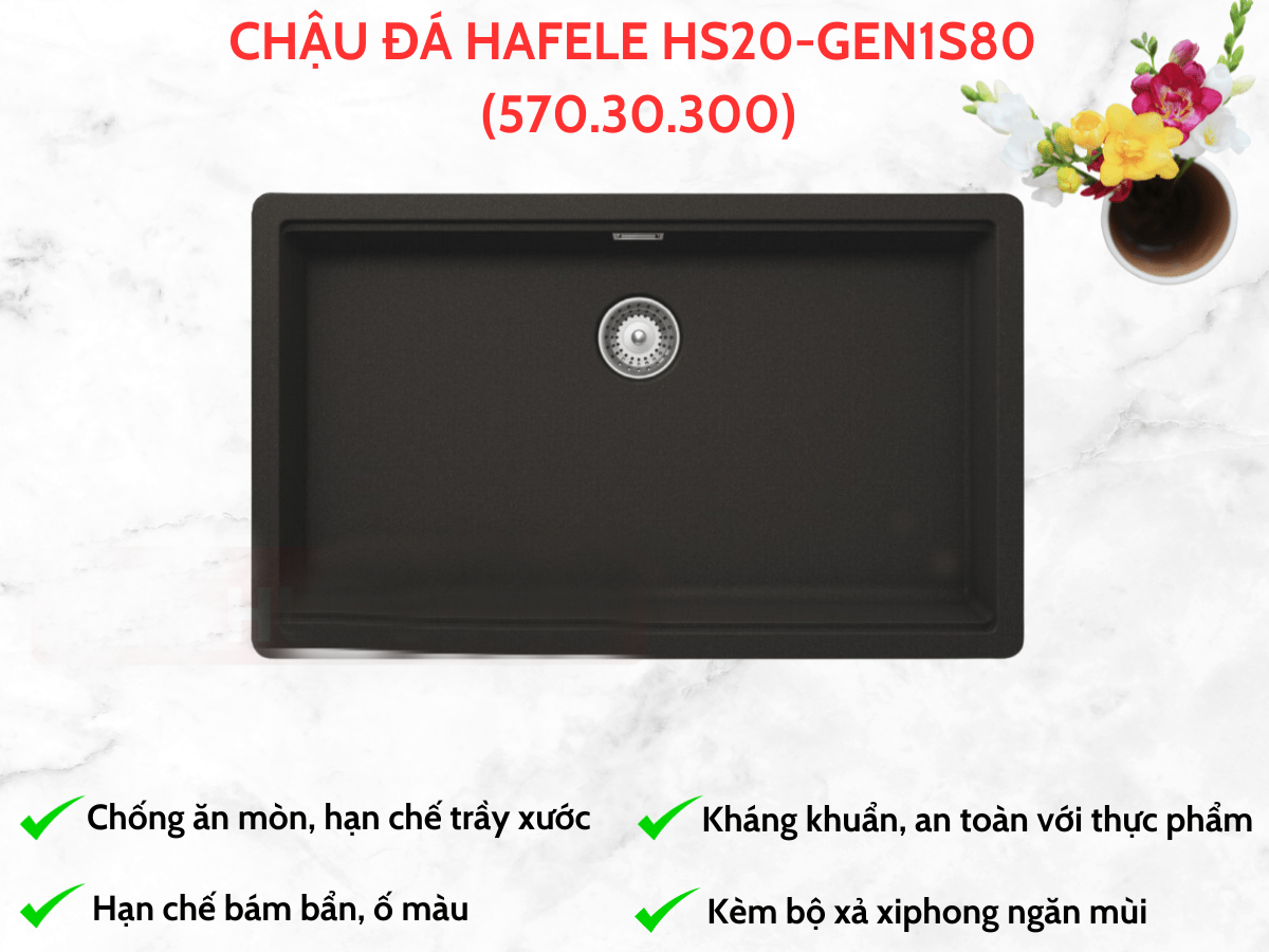 Một điểm cộng lớn ở các sản phẩm chậu đá Hafele nói chung và mẫu chậu Hafele HS20-GEN1S80 (570.30.300) nói riêng là có khả năng kháng khuẩn cực tốt và đảm bảo an toàn với thực phẩm. Bề mặt chậu được xử lý đặc biệt, chống thấm hoàn toàn, hạn chế bám bụi, bám bẩn, ngăn chặn hiệu quả việc hình thành và tích tụ vi khuẩn, nấm mốc.
