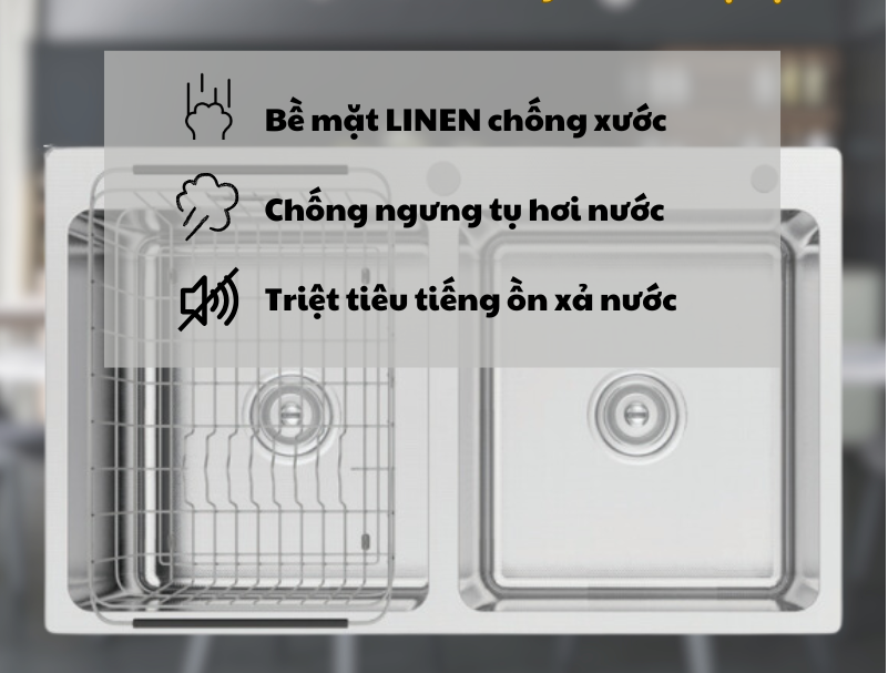Bề mặt chậu rửa được xử lý bằng công nghệ tạo hạt Linen siêu nhỏ, mang lại vẻ đẹp sang trọng, hiện đại. Công nghệ này không chỉ tăng tính thẩm mỹ mà còn có tác dụng chống xước hiệu quả. Việc sử dụng xoong nồi, bát đĩa hàng ngày không làm ảnh hưởng đến bề mặt chậu, giữ cho sản phẩm luôn mới đẹp như ban đầu. Bề mặt hạt Linen cũng giúp hạn chế bám bẩn, dễ dàng vệ sinh, lau chùi, tiết kiệm thời gian và công sức cho người nội trợ.