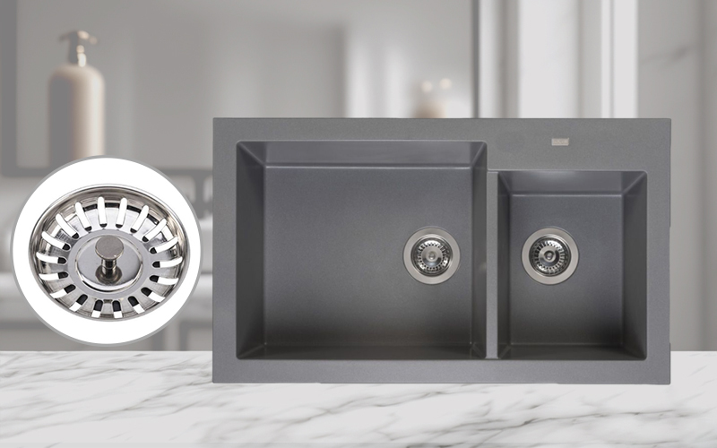 Sản phẩm được bổ sung với nhiều phụ kiện đa dạng như phễu rác và siphon R23471, đem lại sự tiện ích và hiệu quả trong việc ngâm rửa và vệ sinh chậu.