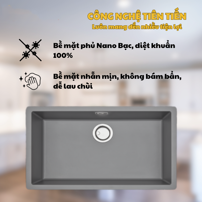 Điểm nổi bật của Malloca ZEN K-13073 là công nghệ phủ Nano Bạc hiện đại, có khả năng diệt khuẩn 100%. Công nghệ này không chỉ ngăn chặn sự phát triển của vi khuẩn trên bề mặt chậu, mà còn giúp bảo vệ sức khỏe người dùng tối ưu, giữ không gian bếp luôn sạch sẽ, an toàn.