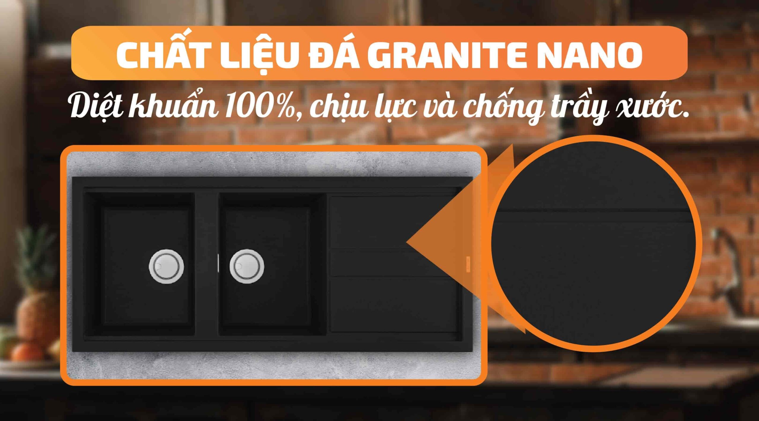 Một tiêu chí quan trọng của chậu rửa chén cao cấp là khả năng diệt khuẩn. Chậu rửa bát đôi Malloca NERO K-50040 được phủ Nano Bạc, giúp diệt khuẩn tối đa. Điều này đáp ứng nhu cầu của những gia đình hiện đại, luôn quan tâm đến tính kháng khuẩn trong các sản phẩm nhà bếp mà họ lựa chọn.