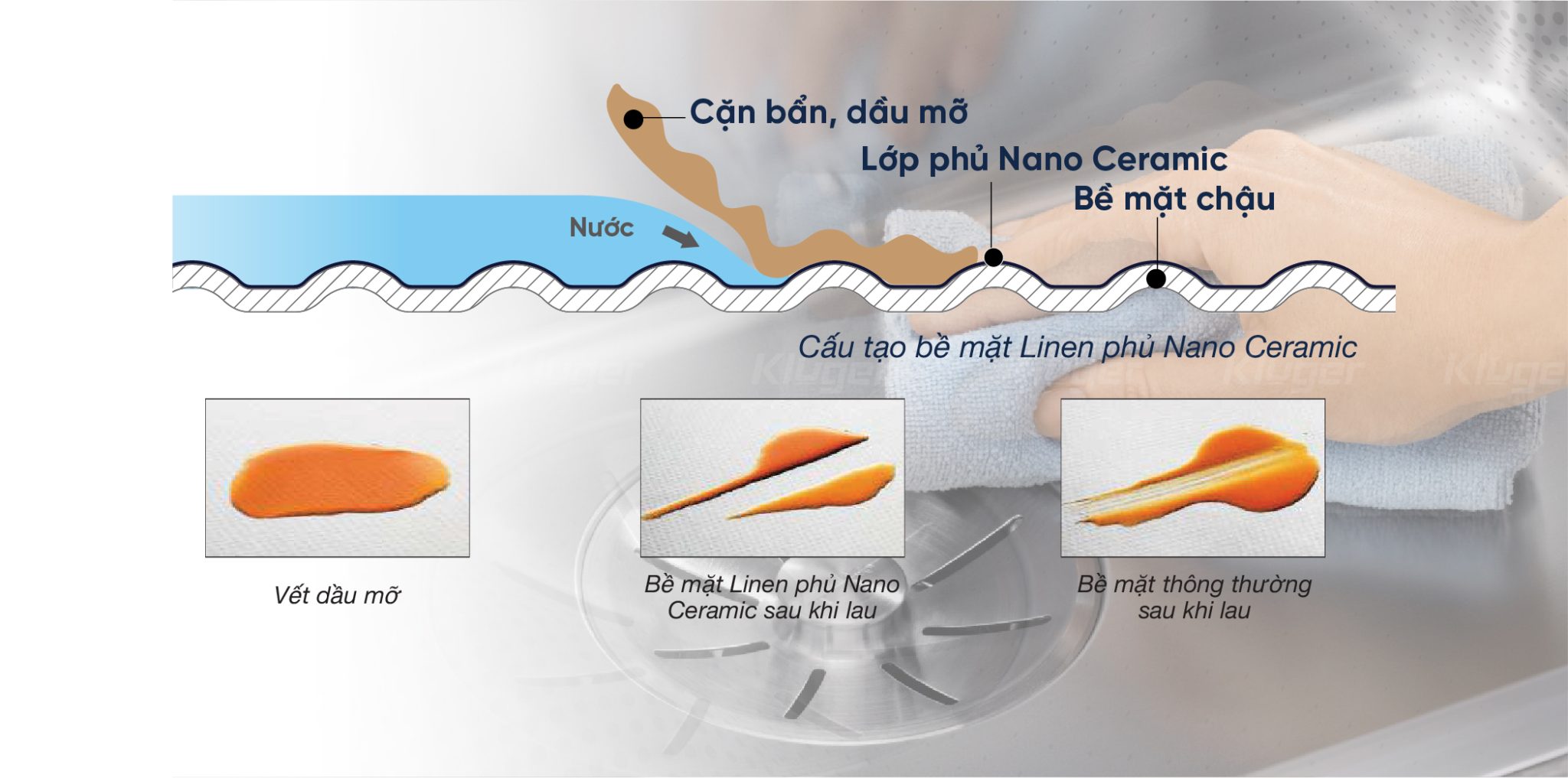 Lớp phủ Nano Ceramic cấu trúc siêu mịn tạo ra một bề mặt ngăn chặn sự thẩm thấu của dầu mỡ và chất bẩn. Kết hợp bề mặt SUPER LINEN tạo nên giải pháp hiệu quả chống bám dầu mỡ, giúp dễ dàng vệ sinh và duy trì vẻ sáng bóng của chậu.