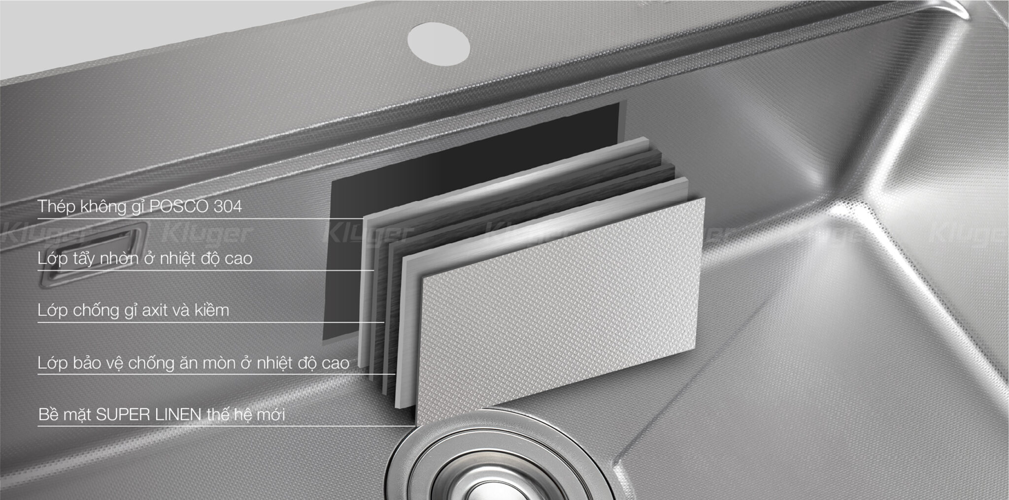 Công nghệ ép khuôn liền khối – Đột phá sáng tạo trong ngành sản xuất, phương pháp này giúp Kluger tạo ra sản phẩm chậu rửa bát / bồn rửa chén có cấu trúc vững chắc từ một mảnh vật liệu POSCO 304 duy nhất không có mối hàn hay vết nối, đảm bảo sự an toàn và tin cậy trong suốt quá trình sử dụng.