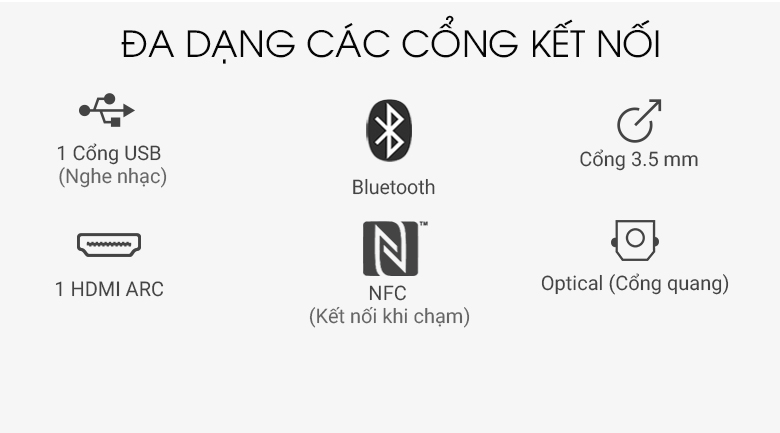 – Kết nối khác:HDMI ARC (cắm tivi), Optical, Jack 3.5 mm, USB
