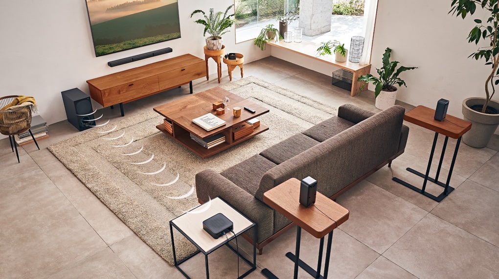 – Bộ sản phẩm bao gồm một loa thanh soundbar, một loa Subwoofer, hai loa sau không dây và bộ khuếch đại không dây.