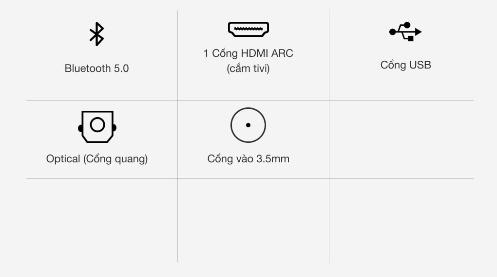 – Dàn âm thanh có khả năng kết nối không dây, có dây đa dạng: Bluetooth 5.0, Cổng vào 3.5mm, HDMI ARC (cắm tivi), Optical, USB.