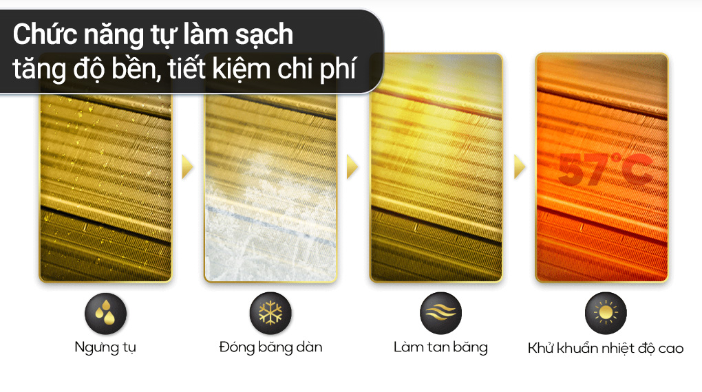 – Lá tản nhiệt bằng nhôm mạ vàng, ống dẫn gas bằng đồng mạ vàng giúp bảo vệ bề mặt dàn tản nhiệt và hạn chế các tác nhân ăn mòn như: muối, mưa, sương,…