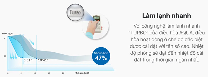 Máy lạnh AQA-KCR12PA của AQUA được tích hợp chế độ Turbo có khả năng làm lạnh nhanh tức thì. Khi kích hoạt nút Turbo trên remote, điều hòa sẽ hoạt động tạo ra một lưu lượng gió lớn hơn để có thể đạt được nhiệt độ lạnh nhanh hơn trong vòng 3 phút, xua tan đi không khí nóng bức trong phòng.