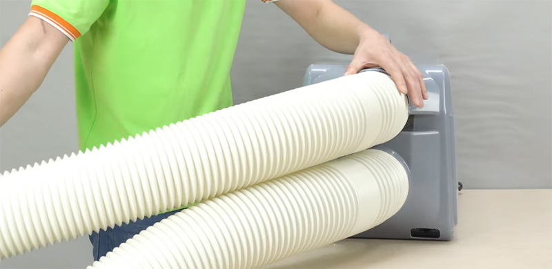 Máy có hệ thống ống dẫn khí đôi, cho phép linh hoạt điều chỉnh cửa khí, tối ưu hiệu suất làm lạnh. Điểm đặc biệt là người dùng có thể đặt máy bên ngoài để đường ống dẫn khí lạnh vào trong phòng, giảm tiếng ồn mà vẫn đảm bảo không khí mát mẻ.
