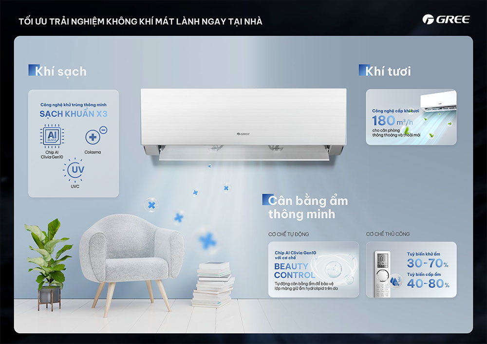 Gree CLIVIA9HI là lựa chọn lý tưởng cho những ai cần một chiếc điều hòa 2 chiều hiện đại, tiết kiệm điện, làm lạnh nhanh, sưởi ấm hiệu quả và được hỗ trợ bởi trí tuệ nhân tạo AI thông minh. Không chỉ làm mát và sưởi, sản phẩm còn mang lại chất lượng sống tiện nghi và khỏe mạnh hơn mỗi ngày.