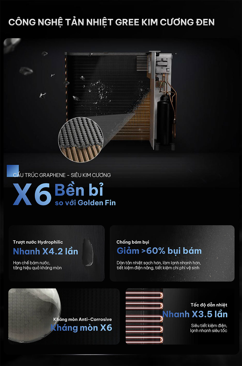 Công nghệ Kim cương đen trên điều hòa Gree có tác dụng gấp 6 lần so với công nghệ Golden Fin cũ trước kia. Với công nghệ kim cương đen, điều hòa Gree cho khả năng nổi bật như: