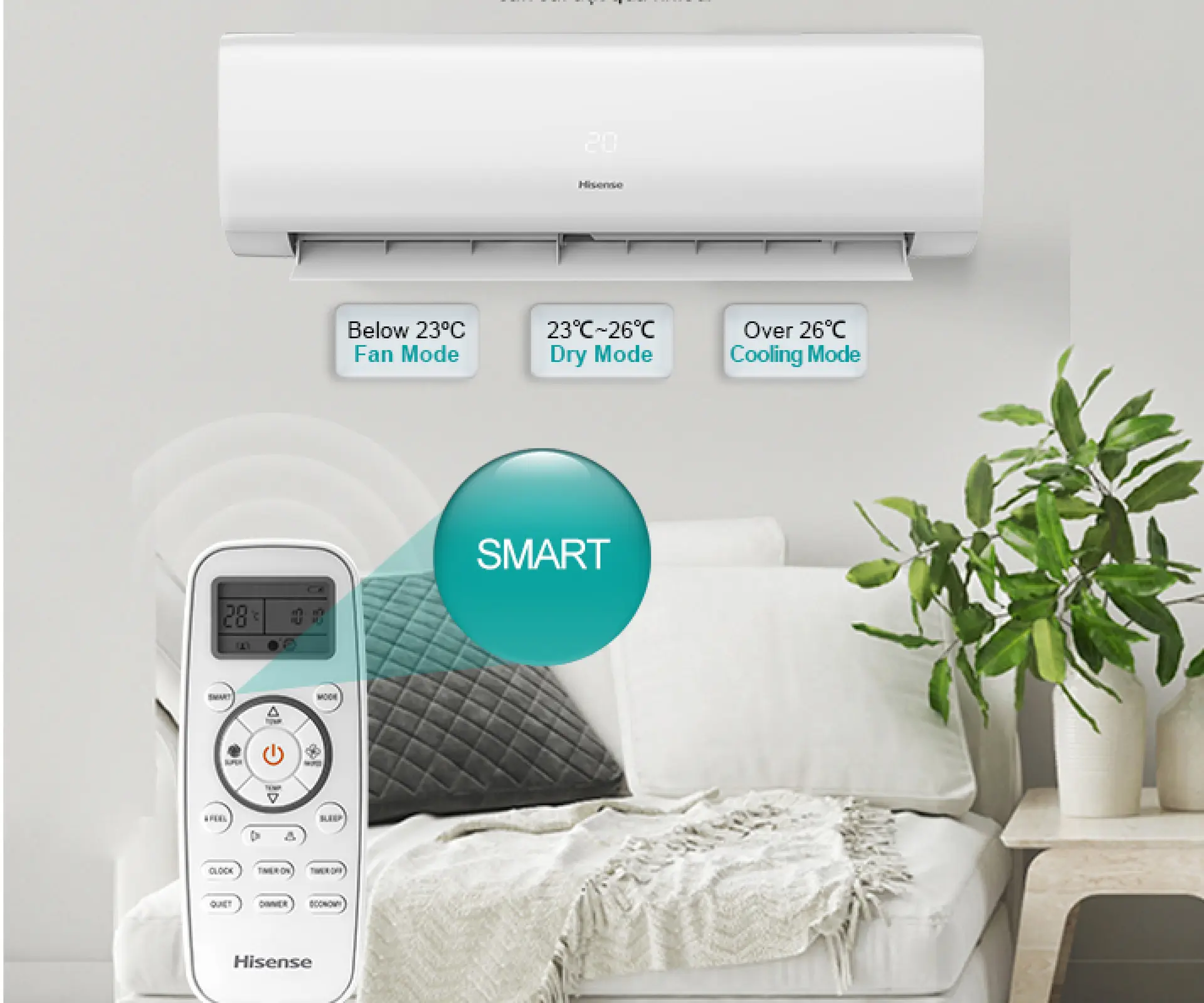 Bạn chỉ cần nhấn nút SMART, máy điều hoà Hisense sẽ tự động điều chỉnh nhiệt độ phòng nhờ công nghệ Fuzzy Logic. Nhiệt độ và tốc độ quạt được cài đặt tự động dựa trên nhiệt độ phòng thực tế. Nhờ đó sẽ giúp người dùng có được cảm giác thoải mái, dễ chịu nhất mà không cần cài đặt quá nhiều.