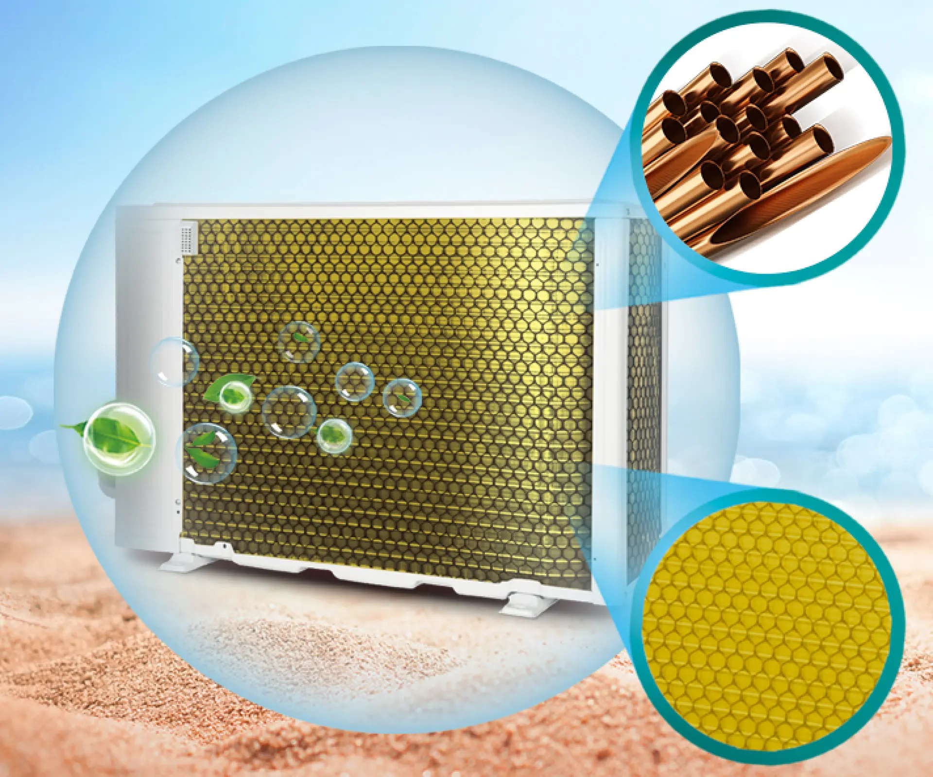 Cánh tản nhiệt mạ thêm lớp sơn vàng chống ăn mòn của Hisense có mức độ chống ăn mòn tốt gấp 3-4 lần so với cánh tản nhiệt thông thường, hiệu quả trao đổi nhiệt cao hơn, tiết kiệm điện năng hơn và kéo dài tuổi thọ của máy điều hòa.