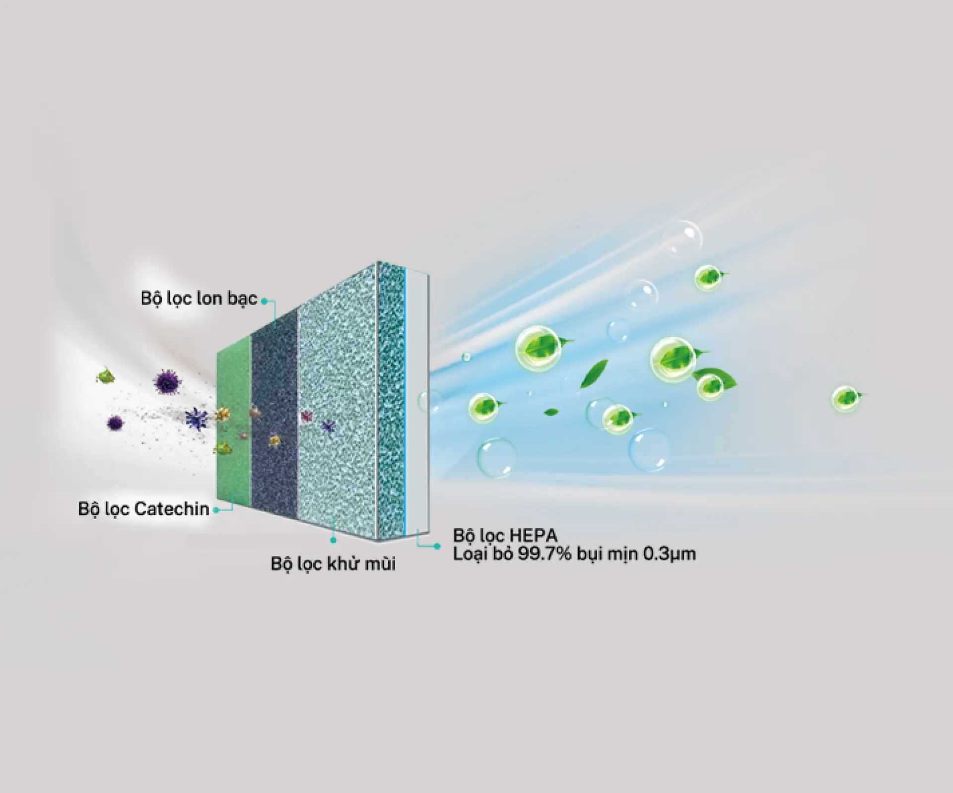 Sự kết hợp của 4 loại bộ lọc khác nhau có thể loại bỏ hiệu quả tất cả các loại bụi bẩn, vi khuẩn, nấm mốc và mùi hôi trong không khí, giúp làm sạch không khí trong nhà, bảo vệ sức khỏe gia đình.