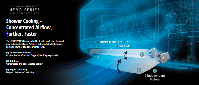 Cánh đảo gió kép AEROWINGS hướng luồng gió mát đi xuống đem lại cảm giác mát lạnh ngay khi khởi động máy. Sau khi đạt đến nhiệt độ cài đặt, cánh đảo gió kép AEROWINGS hướng luống gió lên trên, làm lạnh đồng đều căn phòng.