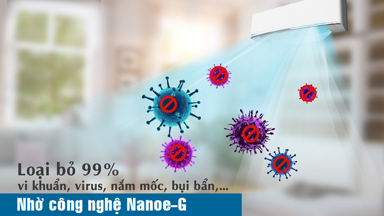 Công nghệ Nanoe-G kháng khuẩn khử mùi vượt trội giải phóng 3 ngàn tỷ hạt siêu nhỏ giúp làm sạch đến 99% vi khuẩn, vi rút, nấm mốc và khử mùi, loại bỏ các vi sinh vật có hại, giúp mang lại không khí trong lành, sạch sẽ bảo vệ sức khỏe cho những người thân yêu nhất.