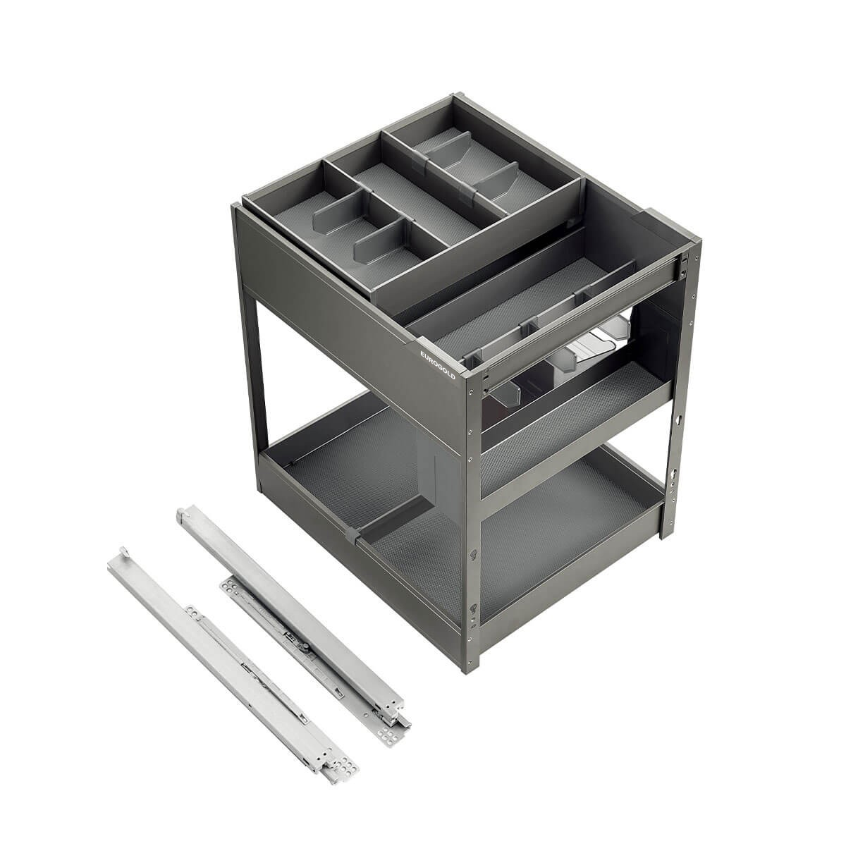 Thiết kế khá nhỏ gọn, giúp bạn tận dụng được tối không gian lưu trữ hệ tủ bếp dưới. Giá gia vị Eurogold EUM2140G được thiết kế bao gồm rổ đựng và hệ thống ray trượt giảm chấn. Việc sử dụng giá (kéo ra/ đẩy vào) trở nên êm ái mà vô cùng nhẹ nhàng. Cấu trúc độc đáo của giỏ kéo ra, có khay đựng dao kéo bên trong trượt, cải thiện tỷ lệ sử dụng không gian.