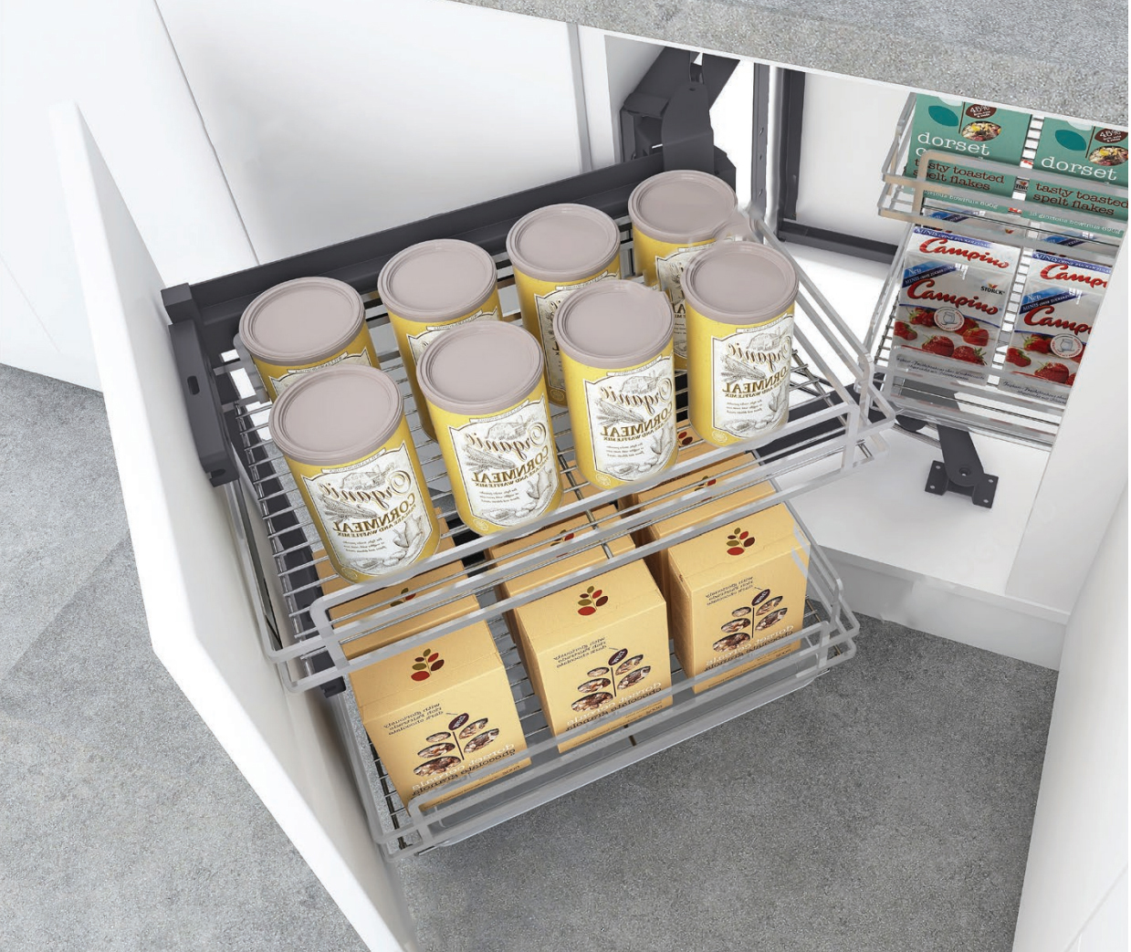 Các khay đựng được thiết kế linh hoạt phù hợp với nhiều kích thước chai lọ, gia vị, nồi chảo khác nhau trong không gian bếp.