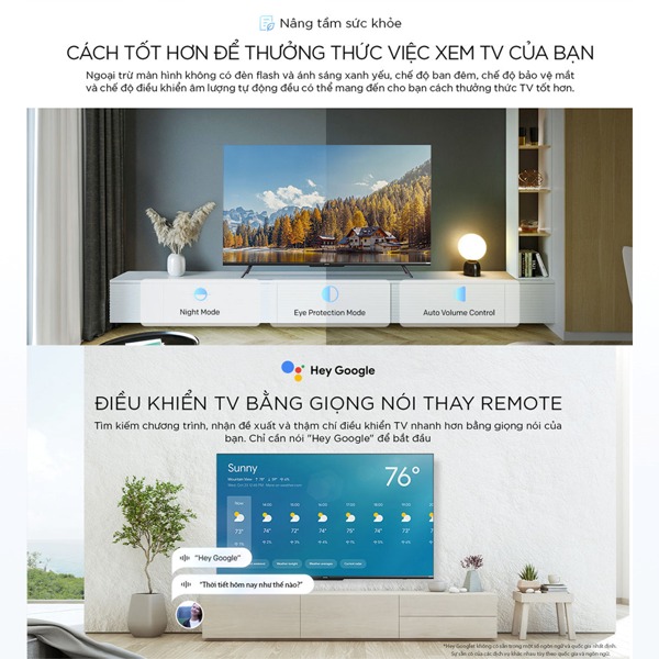 Chỉ với câu lệnh “OK Google” là bạn có thể ra lệnh chiếc tivi yêu dấu này. Thực hiện các thao tác đơn giản mà không cần remote vật lý. Bạn có thể bật, tắt tivi; chuyển kênh; tăng âm lượng; theo dõi thời tiết và nhiều tính năng nổi bật khác