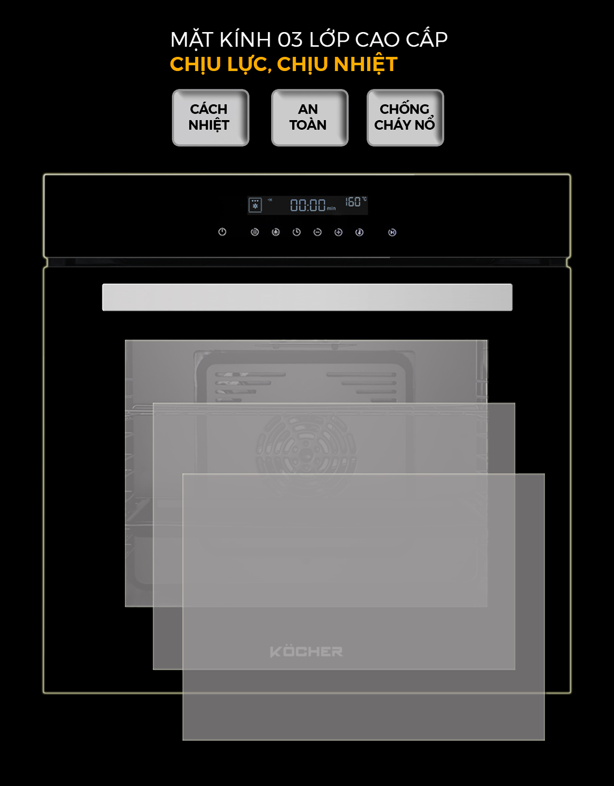 Lò nướng Kocher KOEU-71S14F với thiết kế mặt kính 3 lớp chịu lực chịu nhiệt sang trọng cùng chất liệu inox cao cấp giúp dễ dàng trong việc vệ sinh.