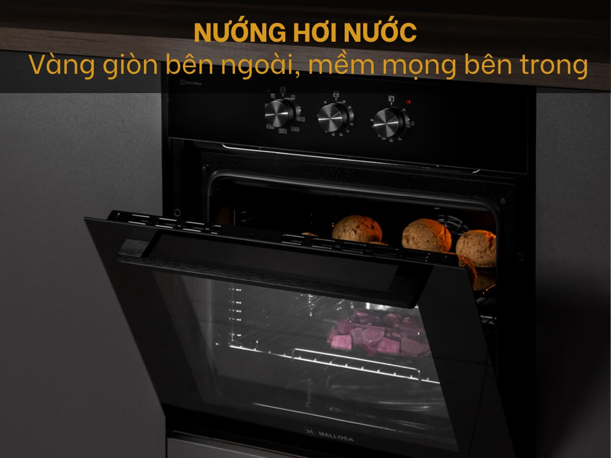 Lò nướng Malloca MOV-659 MCB có một chức năng đặc biệt là nướng hơi nước, với sự bổ sung hơi nước nóng trong quá trình nướng vào thời điểm thích hợp và với một lượng thích hợp, giúp món nướng không bị khô, vẫn đảm bảo vàng giòn bên ngoài và giữ được độ ẩm, mềm mọng bên trong.