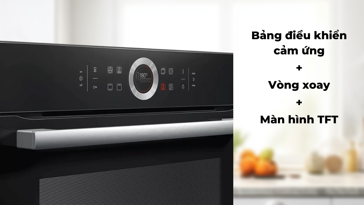 Lò nướng Bosch HMH.HBG633BB1B – Series 8 sử dụng dạng bảng điều khiển cảm ứng kết hợp với vòng xoay giúp người dùng thao tác cài đặt dễ dàng hơn. Đồng thời lò nướng còn được trang bị màn hình TFT hiển thị các thông tin về nhiệt độ, thời gian, chương trình nướng trực quan và rõ ràng. Nhờ đó người dùng có thể theo dõi quá trình nướng chín thực phẩm một cách thuận tiện.