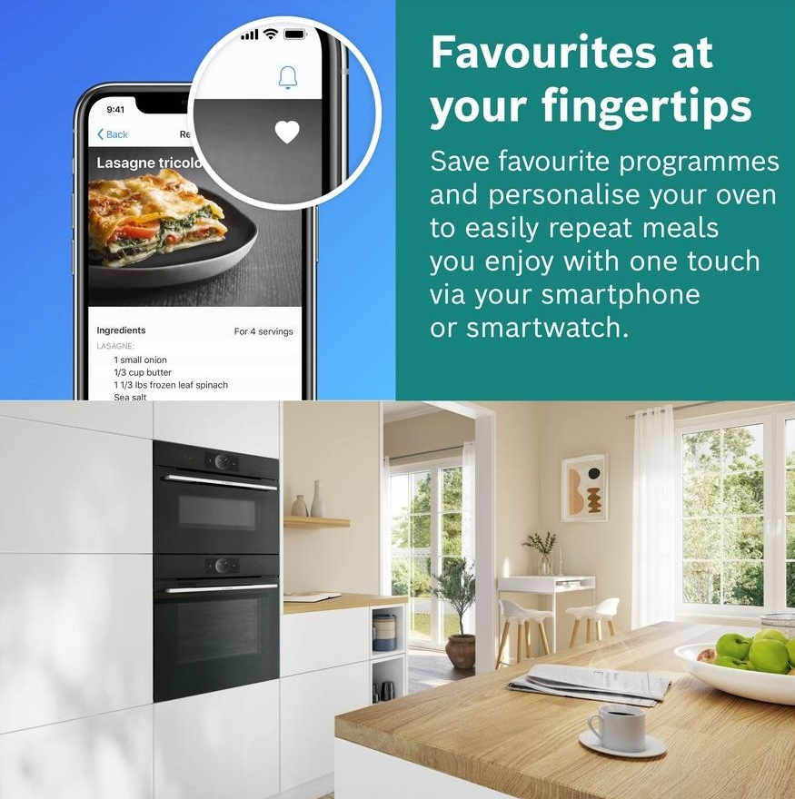 Để tránh phải nhập lại cùng một cài đặt cho món ăn yêu thích của bạn nhiều lần, chỉ cần lưu chúng trong mục “Favourites” để bạn có thể truy cập chúng ngay lập tức và bất kỳ lúc nào, trong ứng dụng Home Connect. Để tận hưởng “Favourites”, chỉ cần kết nối lò nướng Bosch HBG7241B1 của bạn với tài khoản Home Connect đã đăng ký.