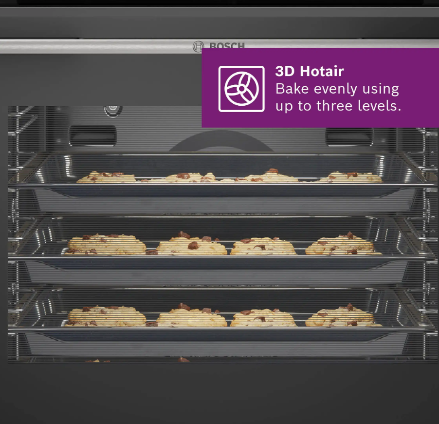 Chức năng 3D Hotair này giúp nhiệt độ lò nướng Bosch HBG7241B1 được phân bổ nhanh chóng và đồng đều, giúp bạn có thể nấu nướng đồng thời ở 3 tầng khác nhau. Các món ăn (ngay cả món ngọt và mặn) đều có thể được nấu cùng một lúc mà không bị mất đi hương vị tinh túy ban đầu.