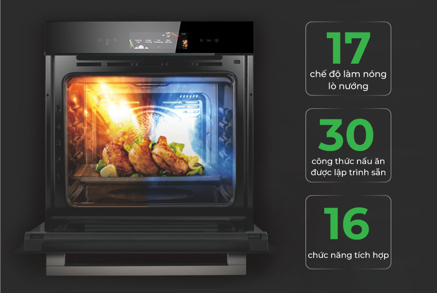 Chức năng làm nóng siêu nhanh và que thăm dò nhiệt độ. Hỗ trợ người dùng nấu nướng một cách chuẩn xác và nhanh chóng. Chức năng hẹn giờ khởi động: Đây là tính năng giúp người sử dụng có thể thiết lập lịch trình hoạt động của lò cho phù hợp nhu cầu đun nấu.Tín hiệu báo kết thúc quá trình nấu ăn: Khi kết thúc chương trình, lò cảnh báo bằng âm “tít” để báo hiệu cho người dùng Chiếu sáng 2 đèn – Twin lamps 17 chế độ làm nóng lò nướng: tùy theo nhu cầu và loại thực phẩm có thể điều chỉnh phù hơp 30 công thức nấu ăn được lập trình sẵn: Lò nướng được lập trình sẵn 80 công thức nấu ăn cho từng loại thực phẩm nhất định, người tiêu dùng có thể dễ dàng chọn chương trình tự động theo bảng chú thích trong quyển hướng dẫn sử dụng. 16 chức năng tích hợp: Đèn, Điện phân, Nhiệt bức xạ, Nướng đôi, Nướng đôi + quạt, Nhiệt dưới + nướng, Quạt thông thường + quạt, Đối lưu, Pizza, Rã đông, ECO, Lên men.. Ngoài ra với mỗi kiểu nướng (nướng đối lưu, nướng quạt, …) còn giúp lò có khả năng tạo ra hàng trăm kiểu chế biến thức ăn khác nhau.