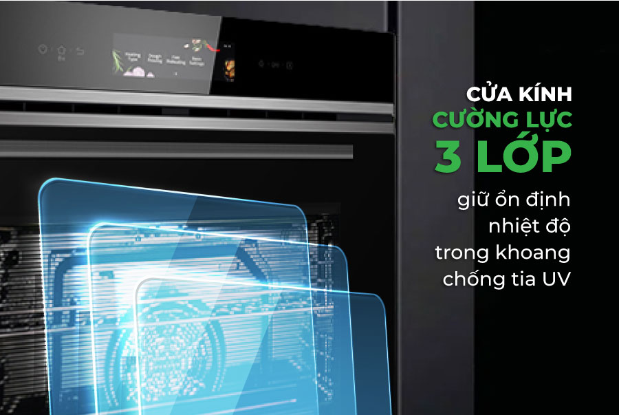 Cửa kính 3 lớp chịu nhiệt, chống tia UV: Lò nướng được thiết kế an toàn tuyệt đối với cửa kính 3 lớp, xen giữa là chân không, giúp cách nhiệt 99% và loại bỏ hoàn toàn tia UV, đảm bảo an toàn tuyệt đối cho sức khỏe nhưng vẫn đảm bảo tính thẩm mỹ Khóa điện tử trẻ em, công tắc tắt an toàn: Biểu tượng khóa phím ngay trên màn hình, chỉ với thao tác nhấn giữ, lò nướng có khả năng vô hiệu hóa bàn phím để tránh những tác động của trẻ em, đảm bảo chương trình hoạt động của lò Công tắc an toàn: Với cảm biến nhiệt độ được tích hợp bên trong lò, nếu có sự cố quá nhiệt do nguyên nhân bên ngoài khiến lò hoạt động không đúng quy trình, chức năng bảo vệ quá nhiệt sẽ kích hoạt để ngừng hoạt động, đảm bảo an toàn về điện và nhiệt cho người tiêu dùng và gia đình.