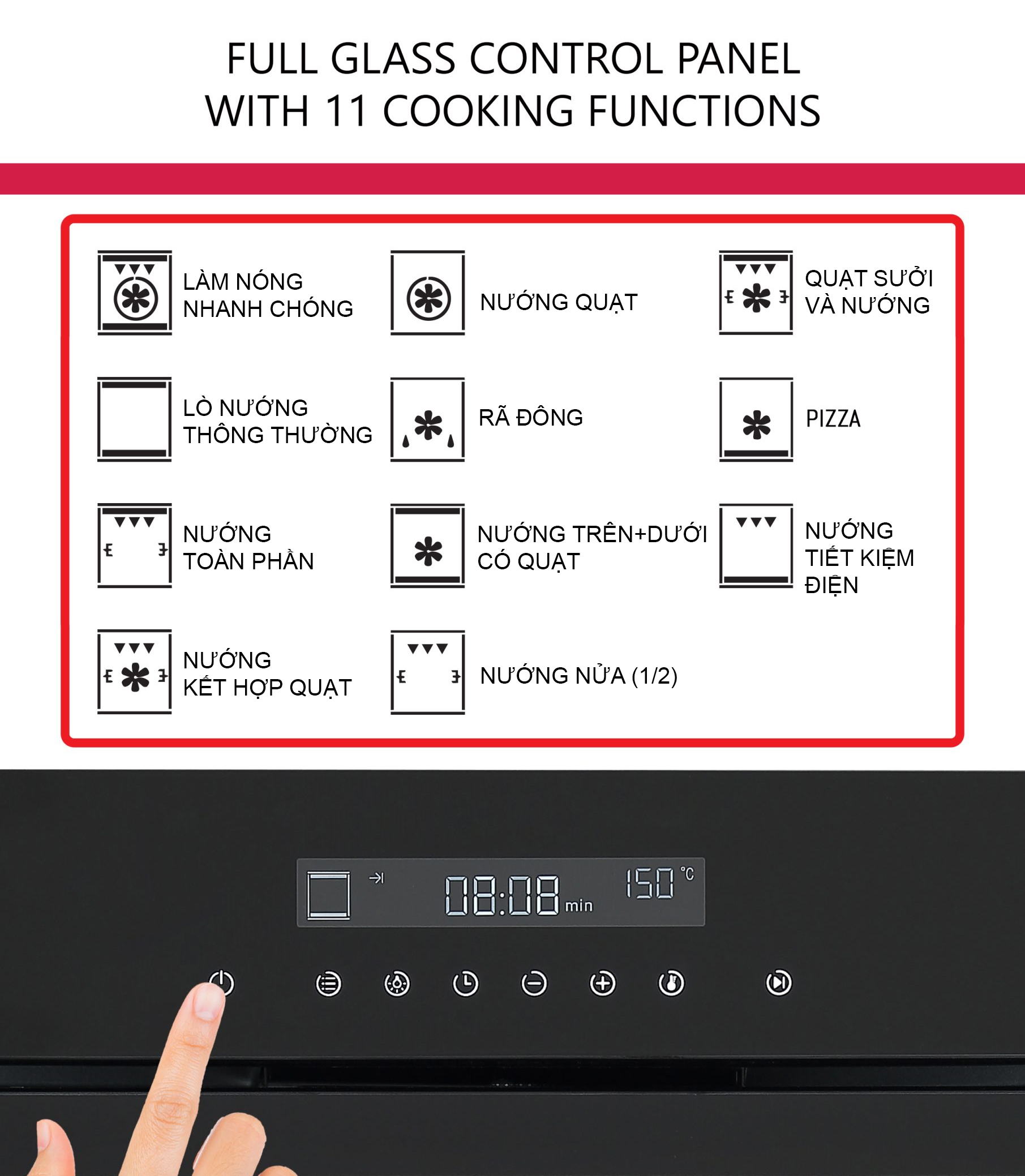 Màn hình LED hiển thị thông tin quan trọng như chế độ nướng, nhiệt độ và thời gian một cách rõ ràng, giúp bạn dễ dàng theo dõi quá trình nấu ăn. Bảng điều khiển cảm ứng nhạy bén cho phép bạn điều chỉnh các chức năng chỉ bằng vài cú chạm nhẹ, mang lại sự tiện lợi tối đa cho những ai yêu thích nấu nướng. Căn bếp của bạn sẽ trở nên sang trọng và tiện nghi hơn bao giờ hết!