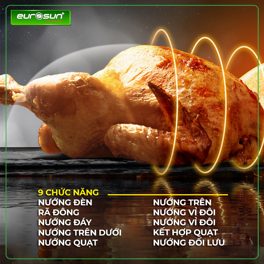 9 chức năng nướng thực phẩm: Bao gồm Nướng đèn, Rã đông, Nướng đáy, Nướng trên dưới, Nướng quạt, Nướng trên, Nướng vỉ đôi, Nướng vỉ đôi kết hợp quạt, Nướng đối lưu