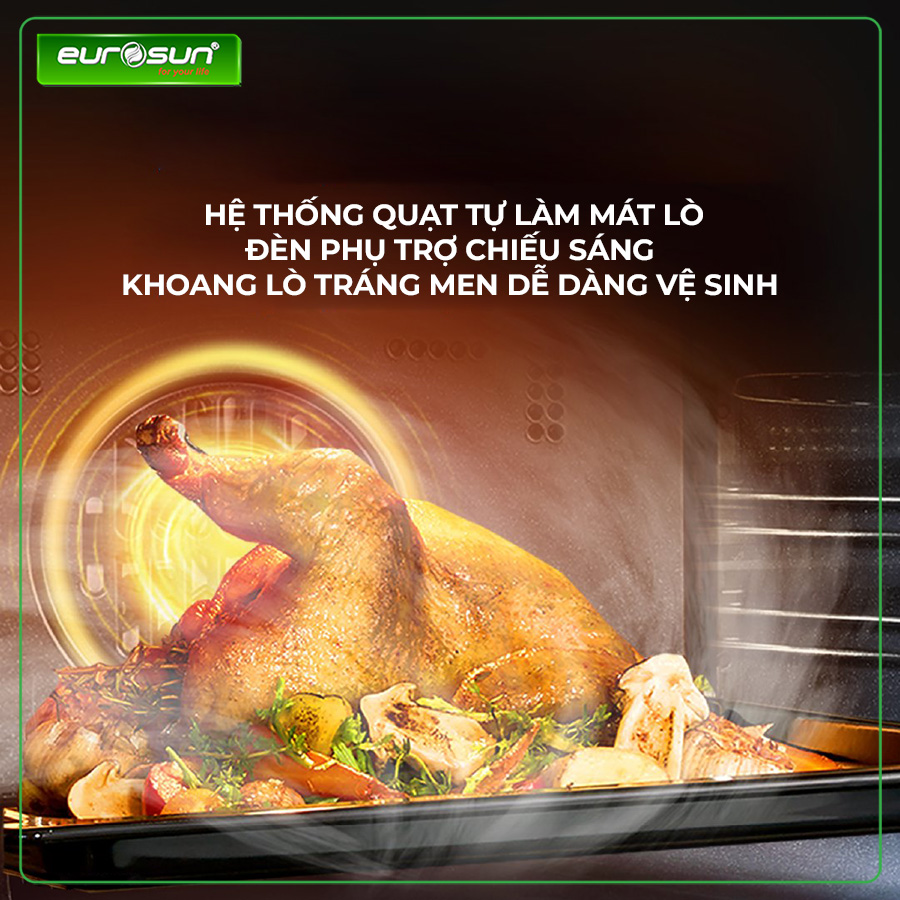 Lò nướng Eurosun EOV65DE nhập khẩu nguyên chiếc từ Malaysia là sản phẩm lò nướng cao cấp, dung tích 65L và phù hợp sử dụng cho đại đa số gia đình Việt.Với thiết kế sang trọng, sử dụng vật liệu cao cấp nhất trong ngành thực phẩm là Inox 304 (18/10) kết hợp kính cường lực đen chống bám bẩn và vân tay, tạo vẻ ngoài sang trọng và cuốn hút. Lò có hệ thống quạt tự làm mát hiệu quả và đèn phụ trợ chiếu sáng khoang lò.