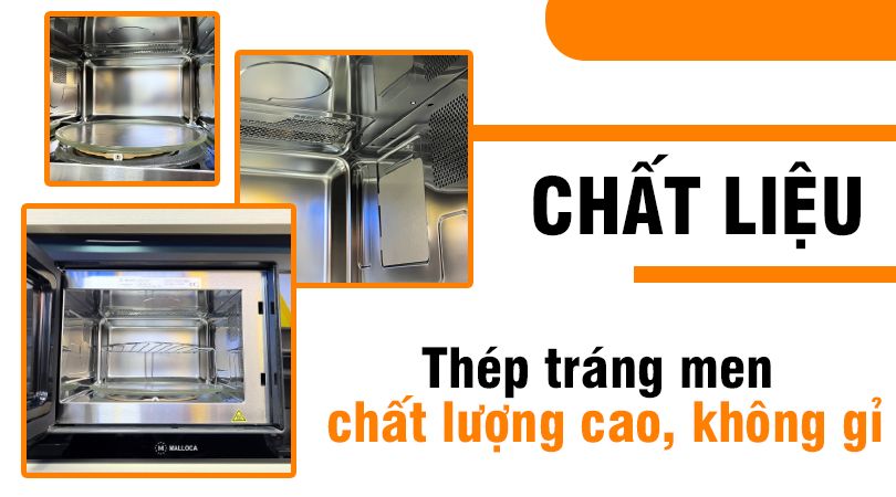 Khung lò được làm từ thép tráng men không gỉ chất lượng cao, tạo nên điểm độc đáo khác biệt. Tích hợp tính năng chống gỉ và mốc, lò vi sóng bảo quản thực phẩm tươi ngon và an toàn. Chất liệu này còn giúp dễ dàng vệ sinh và bảo quản, kéo dài tuổi thọ của sản phẩm.