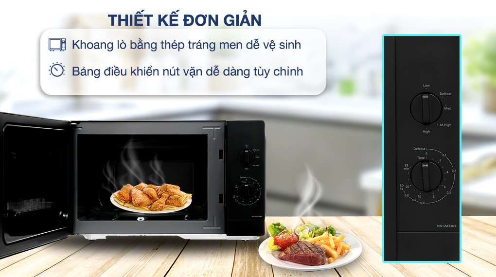 Lò vi sóng Panasonic NN-SM33NBYUE 25 lít hoạt động ổn định với công suất vi sóng 900W được chia làm 5 mức phù hợp với từng nhu cầu hâm nóng, nấu, rã đông. Hơn thế, sản phẩm còn dễ sử dụng với bảng điều khiển nút vặn tùy chỉnh chương trình, thời gian, nút nhấn mở cửa lò, thiết kế đơn giản phù hợp với mọi không gian bếp.