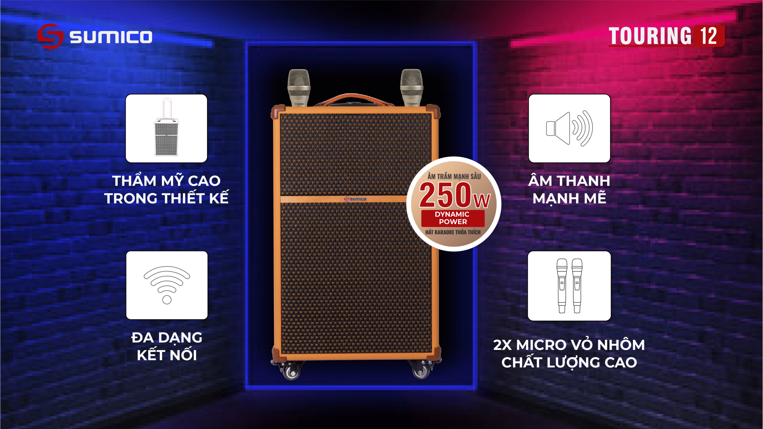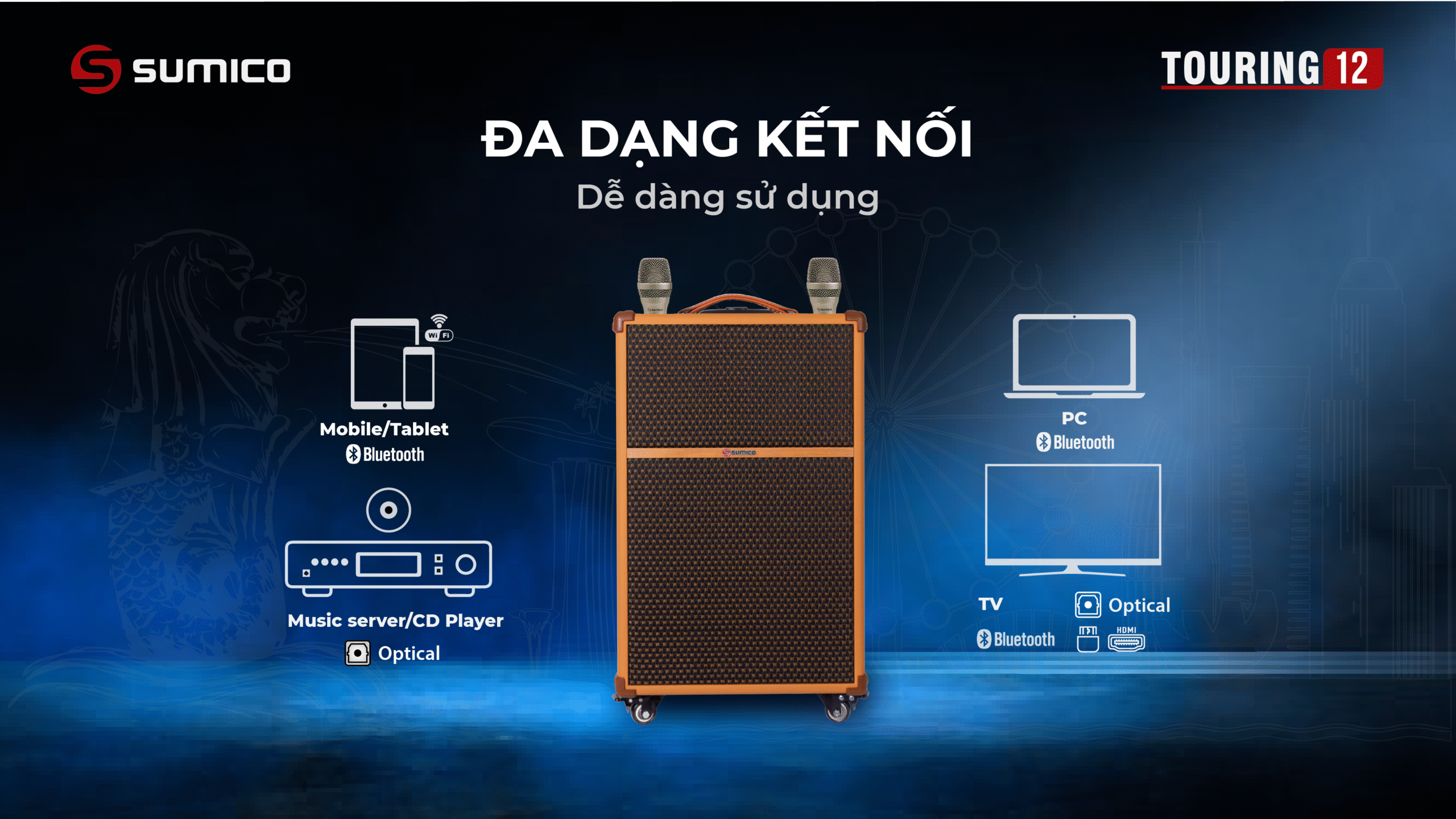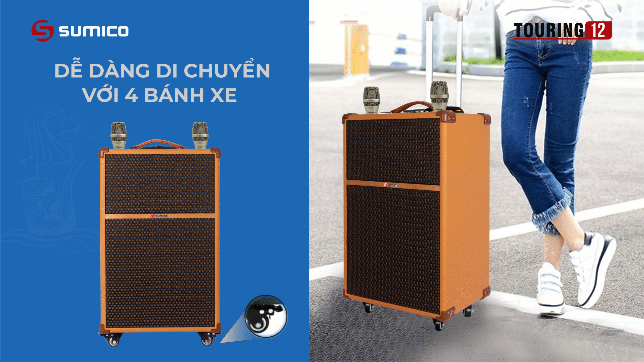 Sumico Touring 12 được thiết kế với tiêu chí hướng tới người dùng có yêu cầu cao về chất lượng âm thanh di động. Bạn có thể kéo loa di chuyển và đặt để vừa vặn thoải mái trong cốp xe hơi khi đi du lịch. Sản phẩm hữu dụng với cấu hình All In One, đầy đủ nhất cho nhu cầu giải trí di động mọi lúc mọi nơi cho những chuyến du lịch, vui tiệc tại homestay, resort: nghe nhạc, xem phim, hát karaoke, chơi đàn guitar v.v…