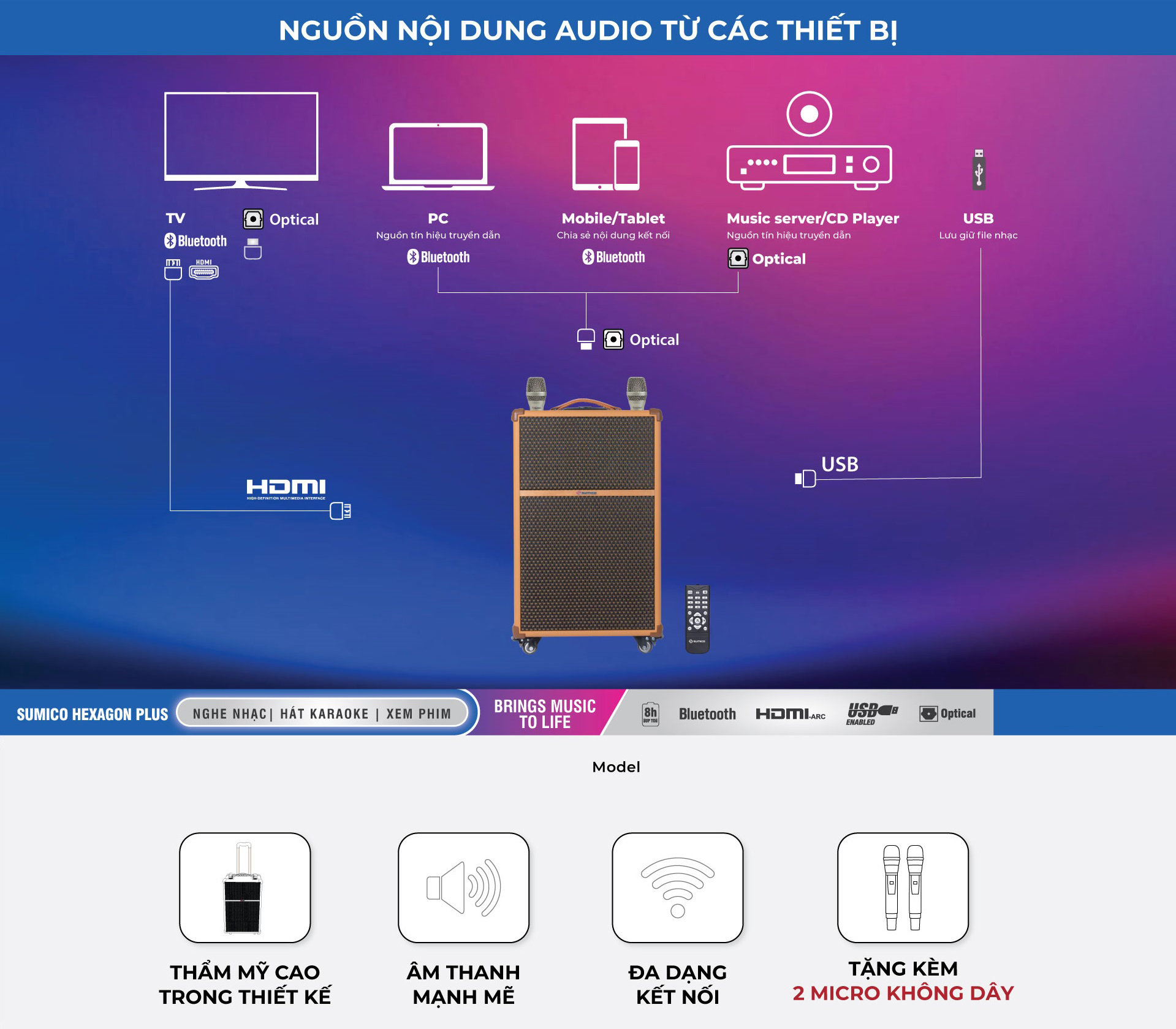 – Nghe nhạc và Karaoke di động qua kết nối Bluetooth 5.0, USB, giải trí cùng Tivi qua kết nối Optical và HDMI(ARC).