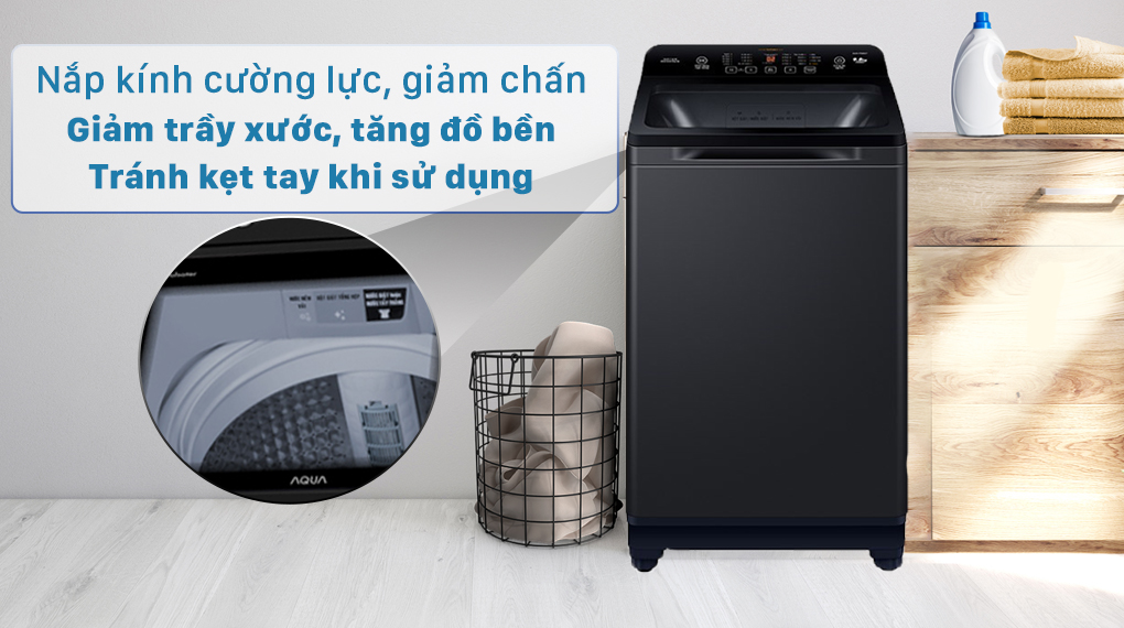 Được trang bị nắp kính chịu lực chắc chắn, bền bỉ, có hỗ trợ giảm chấn, đóng mở nhẹ nhàng, hạn chế kẹt tay trong quá trình sử dụng. Máy giặt Aqua 8.8 KG AQW-FR88GT.BK thích hợp cho các gia đình có trẻ nhỏ.