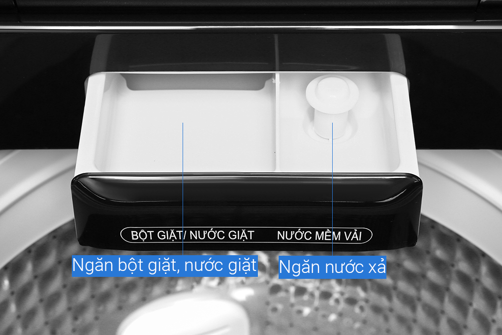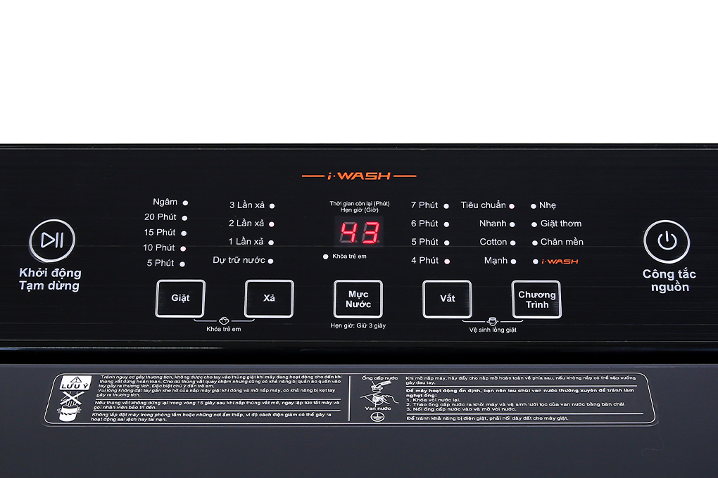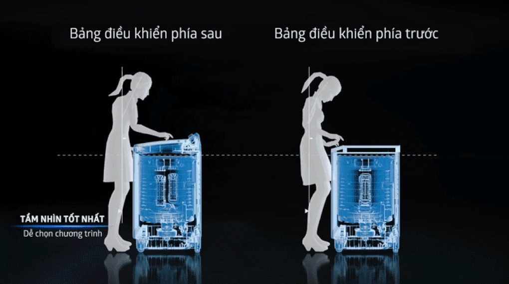 Bảng điều khiển được đặt phía sau, cho phép người sử dụng có góc nhìn tốt nhất, dễ dàng lựa chọn các chương trình giặt quần áo, tránh nước tiếp xúc gây hư hỏng bảng điều khiển.