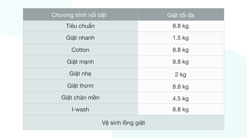 Khối lượng 8,8 kg phù hợp cho gia đình từ 3 – 5 thành viên