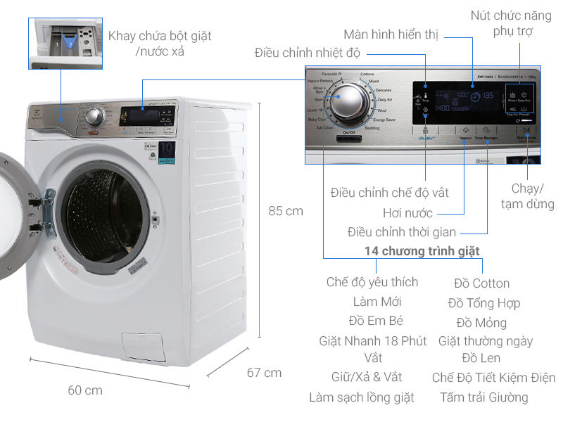Máy giặt Electrolux Inverter 10 kg EWF14023 là dòng máy giặt lồng ngang cao cấp, có thiết kế sang trọng và trang nhã. Sản phẩm sẽ là điểm nhấn nổi bật cho mọi ngôi nhà.