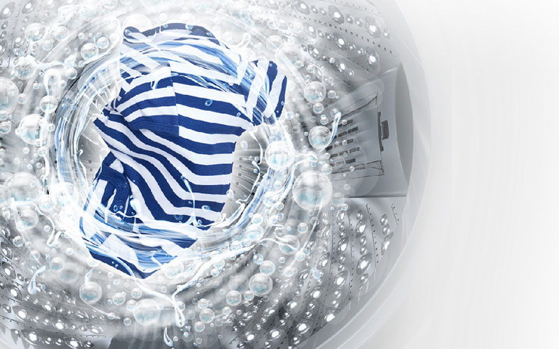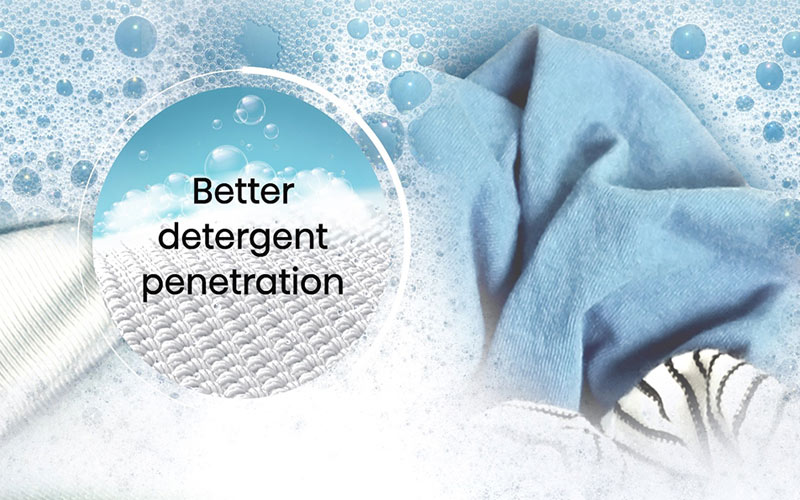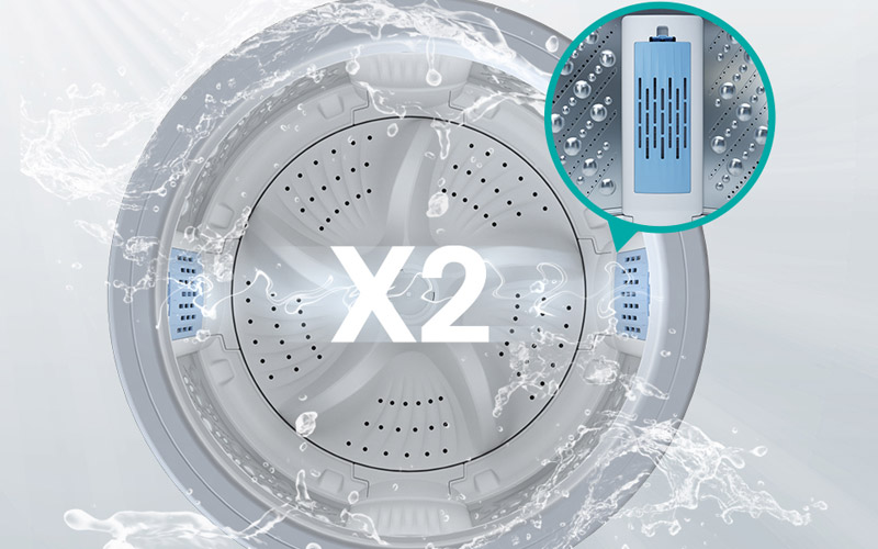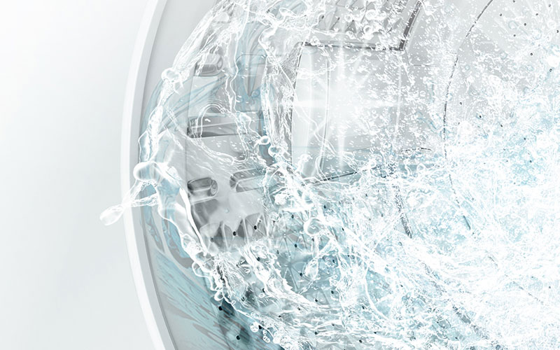 Sự kết hợp giữa lồng giặt đứng tạo ra chuyển động giặt xoay đều cùng với các tia nước mạnh theo kiểu thác nước tạo ra vô số các bong bóng nước. Các bong bóng này sẽ thâm nhập sâu vào quần áo và đánh tan các loại vết bẩn cứng đầu mà người dùng không cần phải tốn nhiều công sức giặt tẩy như vết trà, cà phê, hay vết dầu mỡ, đảm bảo cho quần áo áo của bạn luôn được sạch sẽ.