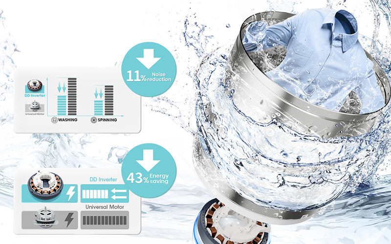 Nhờ được trang bị động cơ DD inverter, máy giặt Hisense WT5J1313DT có thể giảm đến 11% độ ồn so với các máy giặt thông thường trong quá trình hoạt động, đảm bảo cho gia đình bạn có những giờ phút nghỉ ngơi yên tĩnh. Ngoài ra, hệ thống này còn giúp tiết kiệm đến 43% lượng điện năng tiêu thụ, qua đó giảm được phần nào chi phí sinh hoạt hàng tháng cho người dùng, đặc biệt là những gia đình đông người và phải sử dụng máy giặt thường xuyên.