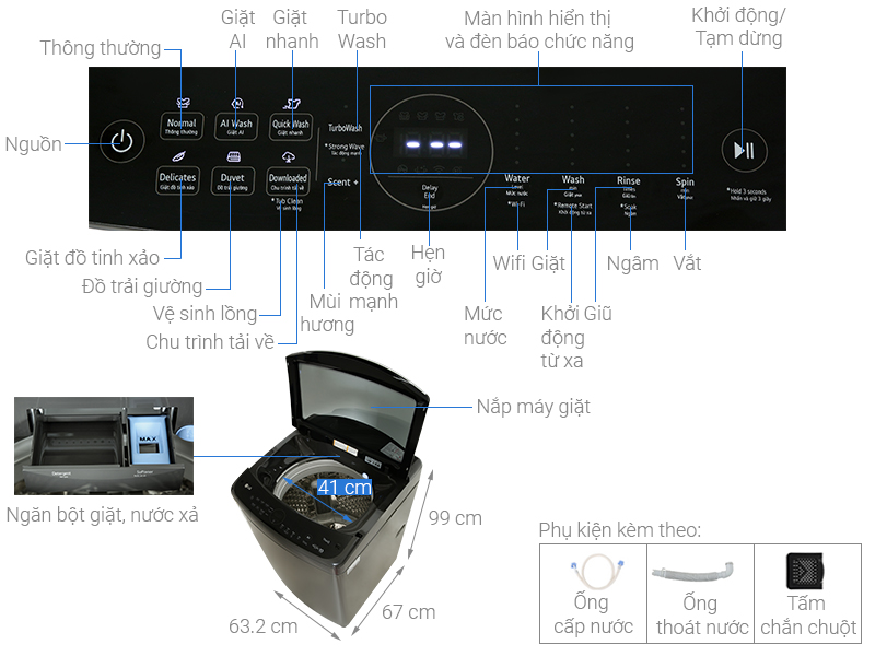 – Tích hợp sẵn 8 chương trình giặt tiện lợi, bao gồm: giặt AI, giặt sơ + thông thường, TurboWash, giặt chăn ga, giặt nhanh, giặt thường, vệ sinh lồng giặt và chu trình tải về phù hợp với nhu cầu sử dụng đa dạng của các thành viên trong gia đình. Trong đó, chương trình giặt nhanh phù hợp với số lượng ít quần áo và ít bẩn giúp tăng tốc độ giặt, tiết kiệm thời gian.