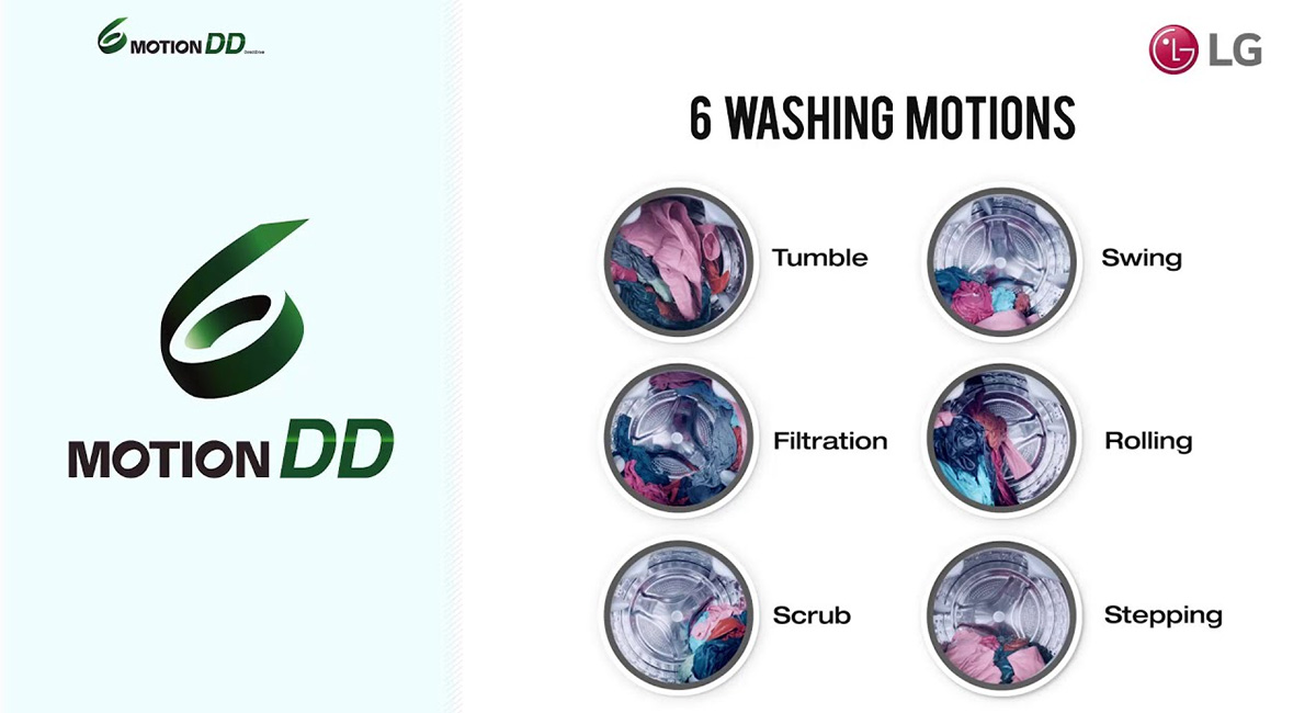 Máy giặt được LG trang bị công nghệ giặt 6 Motion DD, với động cơ Inverter Direct Drive™, có khả năng tạo ra đến sáu chuyển động giặt khác nhau. Công nghệ này không chỉ giúp chăm sóc vải đúng cách mà còn đảm bảo quá trình giặt diễn ra một cách hiệu quả, mang lại kết quả giặt siêu sạch.