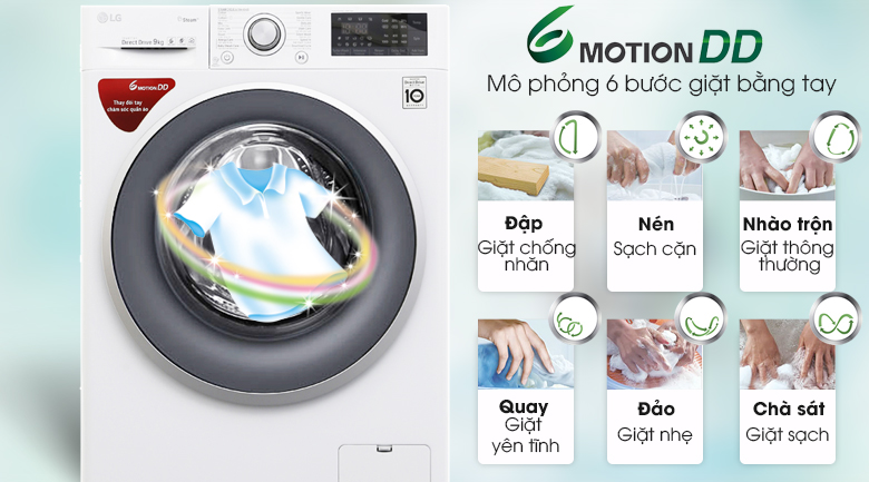 Nỗi lo lắng về quần áo bị sờn rách hay tưa chỉ khi giặt máy sẽ không còn đáng bận tâm vì đã có công nghệ giặt 6 chuyển động của máy giặt. Nhờ phô phỏng thao tác giặt bằng tay của con người, công nghệ giặt 6 chuyển động này sẽ giúp nâng niu từng sợi vải, bảo vệ cho quần áo luôn được bền đẹp như mới.