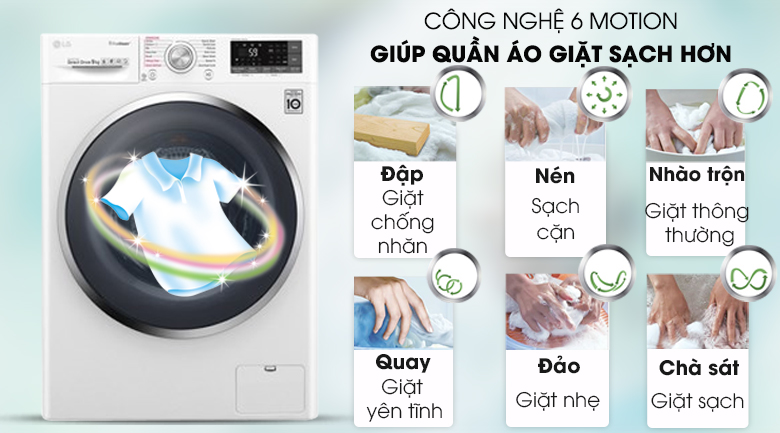 Nhờ công nghệ 6 Motion mà quần áo được giặt sạch hơn rất nhiều, do cơ chế chuyển động của máy linh hoạt giống như quần áo đang được giặt bằng tay, nhất là hạn chế được tình trạng quần áo bị xoắn rối.